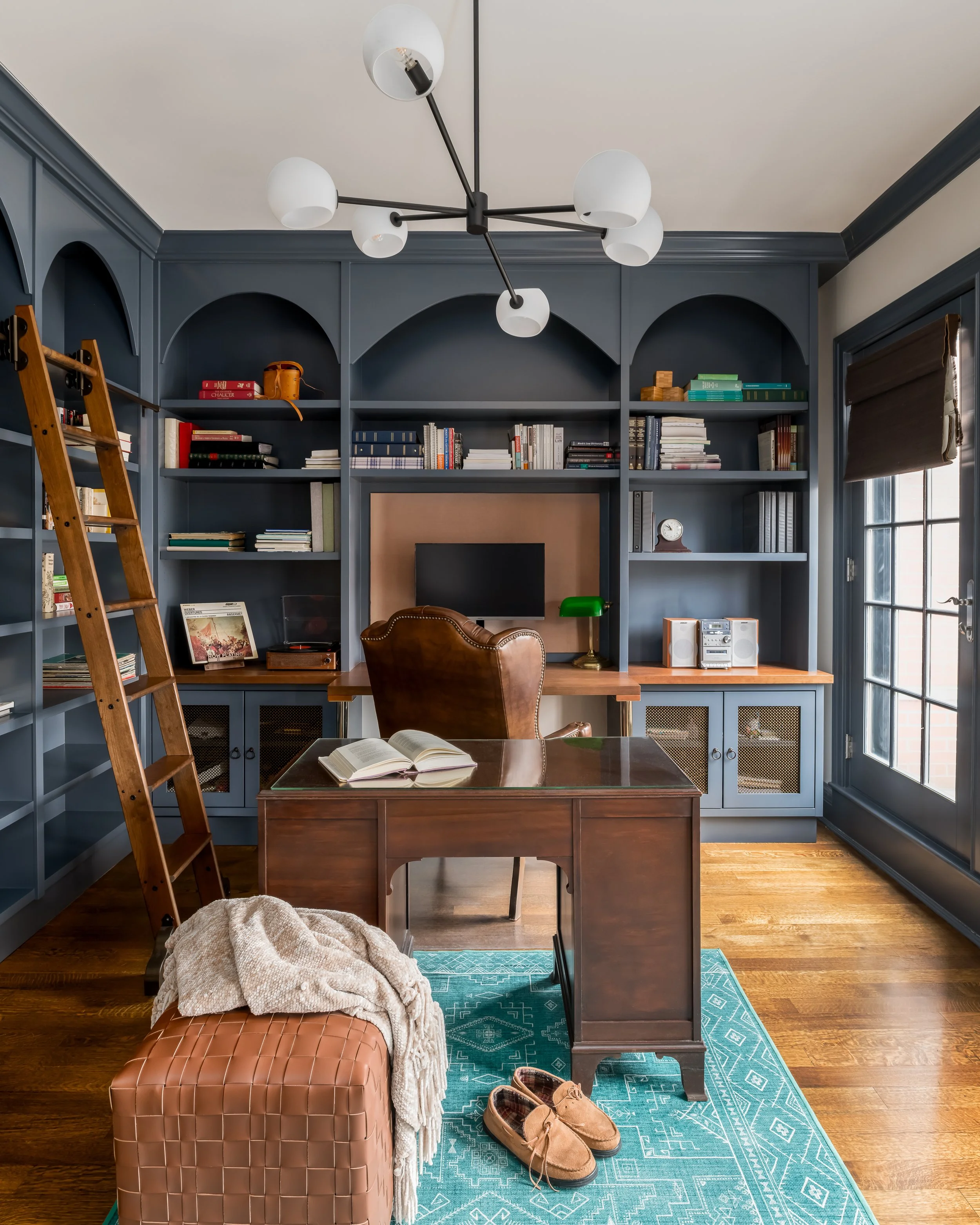 Adding custom built-ins in Benjamin Moore 'Ocean Floor' add grandeur to what was a pretty ordinary space. The bookcases with rolling library ladder add so much character and seemingless endless storage.